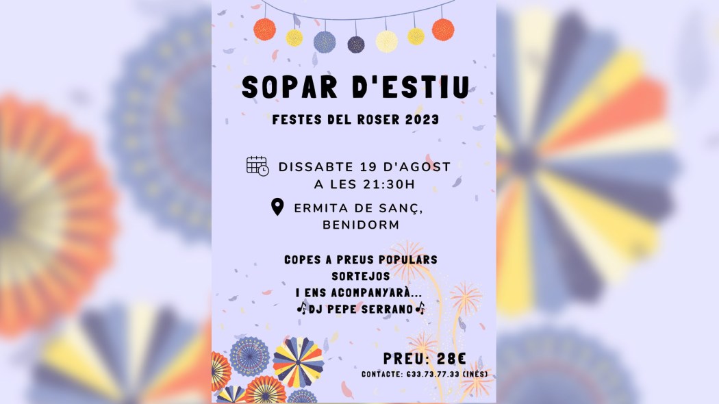 La presidenta de les Festes del Roser, Inés Mira, ha querido enviar un mensaje de agradecimiento “a todas las personas que nos acompañarán el sábado en este tradicional ‘Sopar d’Estiu’ y a todas las empresas que, de una forma u otra, hacen posible la celebración de este evento”. Mira se ha mostrado convencida de que “pasaremos una noche especial en la ermita, un lugar que nos recuerda la importancia de mantener las costumbres y tradiciones de nuestra tierra”.