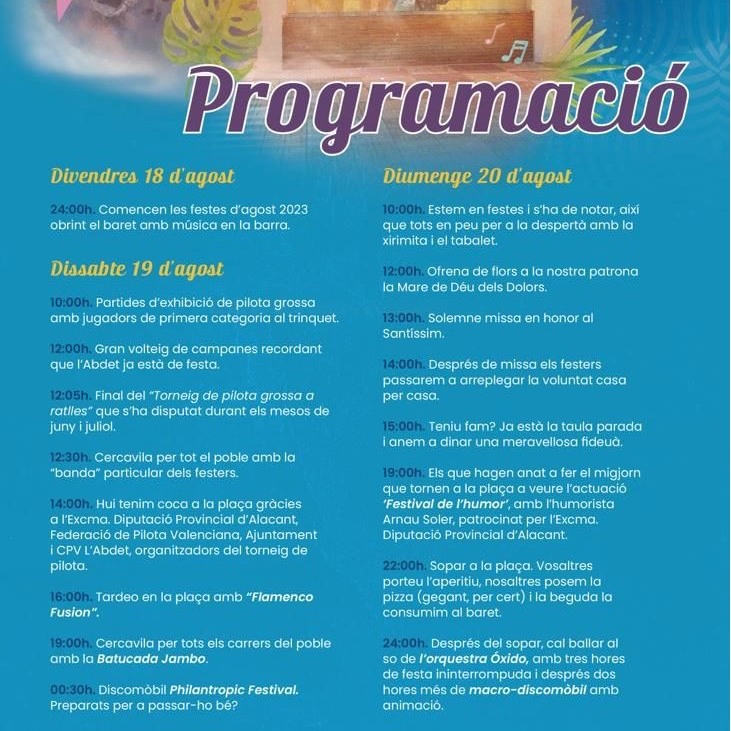 J.M.P. Nuestra señora de los Dolores será honrada en el Abdet a través de sus fiestas patronales que darán inicio el sábado 19 de agosto. Este núcleo que pertenece administrativamente a Confrides celebrarán sus fiestas este fin de semana como también lo hacen en nuestra comarca Finestrat, Albir, Bolulla o las fiestas del barrio del Pati Fosc en Villajoyosa. Centrándonos en el núcleo poblacional situado a los pies de la Sierra de la Serrella, ya el viernes por la noche abren su barra festera. El sábado a las diez horas dan inicio las partidas de exhibición de pilota Grossa siendo la gran final a las 12 del mediodía. A las dos reparto de cocas en la plaza. A las cuatro Tardeo con Flamenco Fusión, a las siete Batucada y a las doce y media de la noche Discomovil.