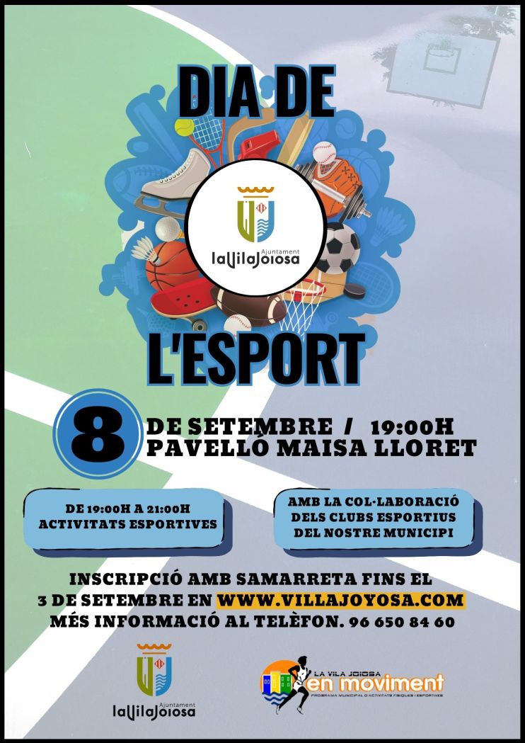 La concejalía de Deportes organizará el Día de Deporte con la participación de todos los clubes deportivos de Villajoyosa. La jornada de convivencia se celebrará el próximo 8 de septiembre en las instalaciones deportivas del pantano y el pabellón Maisa Lloret desde las 19.00 horas y hasta las 21.00 horas.