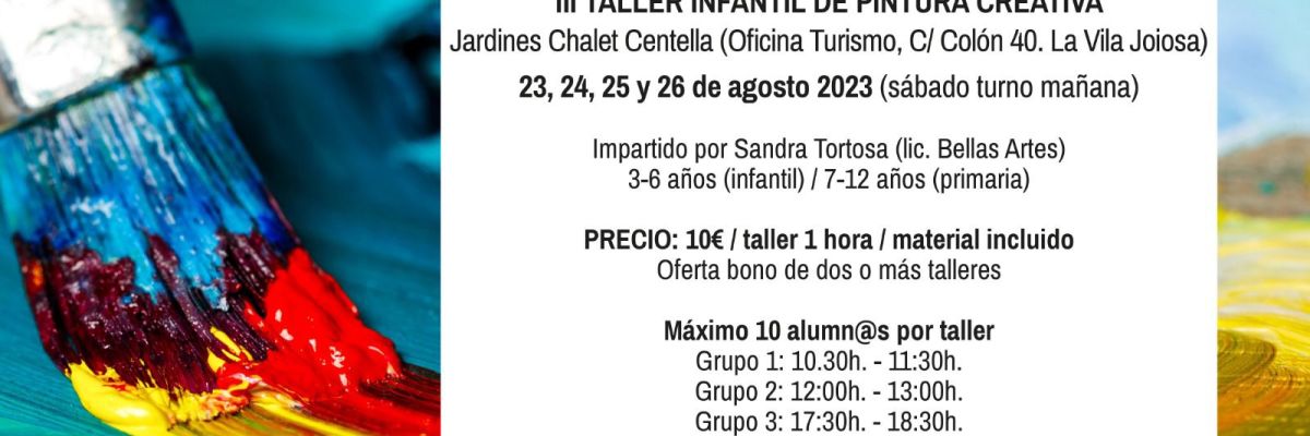 Los talleres de pintura se imparten los días 23, 24, 25 y 26 de agosto distribuidos por grupos de niños y niñas de 3 a 6 años y de 7 a 12 años.