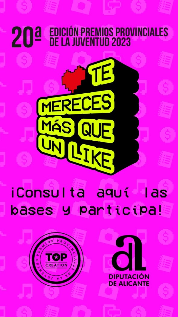 El plazo de presentación de trabajos a la XX edición de los Premios #TopCreation encara su recta final. El viernes 8 de septiembre concluye el periodo para poder participar en este certamen lúdico y didáctico con el que la Diputación de Alicante pretende reconocer y poner en valor el ingenio, el talento y la creatividad de los jóvenes de la provincia.