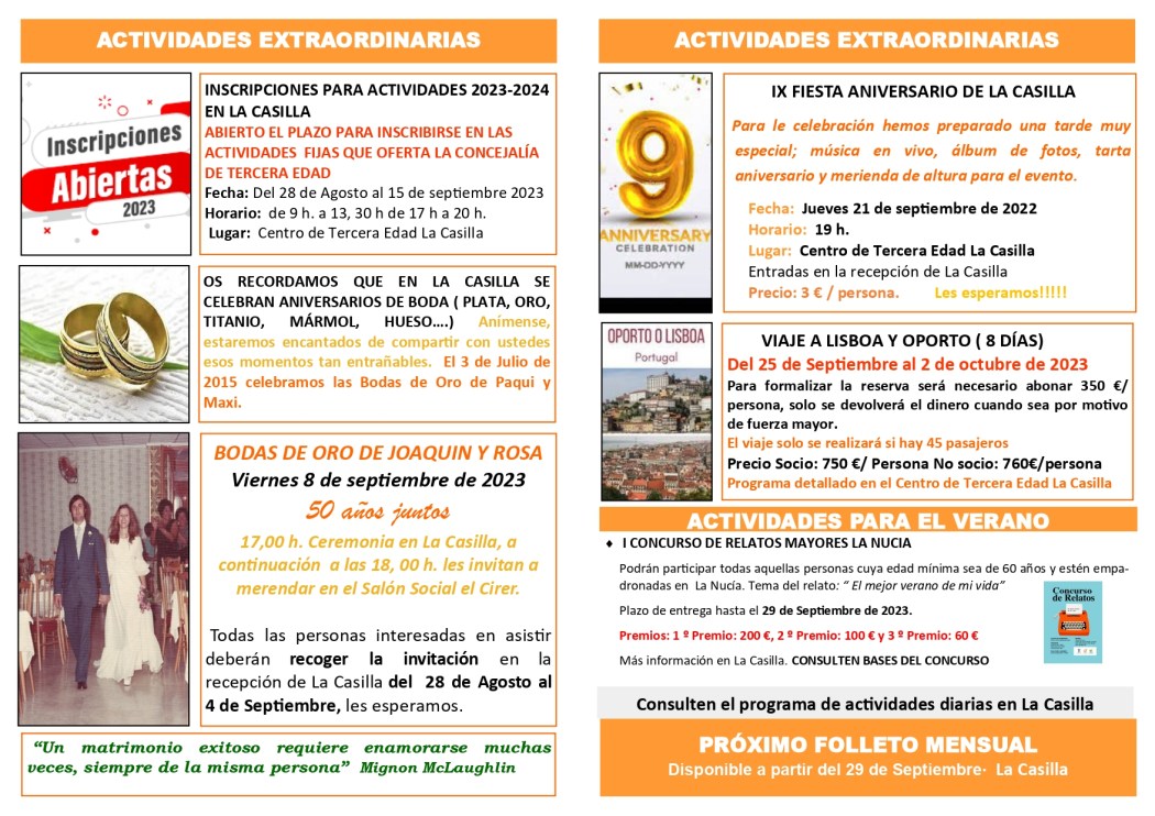 La concejalía de la Tercera Edad en colaboración con la Asociación de Jubilados y Pensionistas de La Nucía ha elaborado la programación de actividades para el mes de septiembre de 2023, entre ellas destacala fiesta de IX Aniversario de La Casilla y el viaje a Lisboa y Oporto.