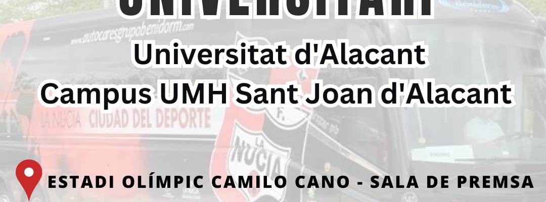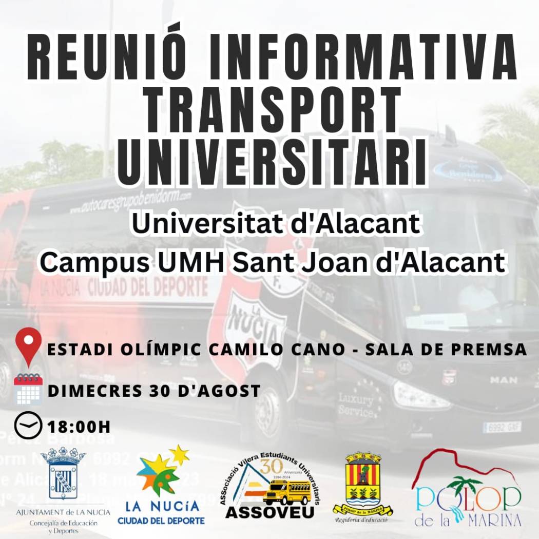 El próximo miércoles 30 de agosto a las 18 horas en la sala de prensa del Estadi Olímpic Camilo Cano tendrá lugar una reunión informativa sobre el transporte universitario para estudiantes de La Nucía y otros municipios de la comarca de la Marina Baixa. En ella se dará a conocer los detalles sobre el tipo de servicios y horarios que se ofrecen de cara al curso académico 2023-2024.
