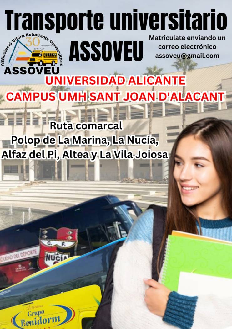 La reunión de ayer tiene como finalidad fletar un autobús que reúna alumnado de Polop de la Marina y La Nucía y que haga el trayecto directo a los campus de Universidad de Alicante o en el de Sant Joan d’Alacant de la Universidad Miguel Hernández. Para ello, es importante que la gente interesada se inscriba a través del correo: assoveu@gmail.com, también a través de este teléfono: 633 096 830 o cumplimentando el formulario de este enlace https://forms.gle/qReDti7Me886tC1GA