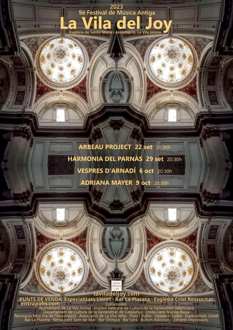 Las agrupaciones musicales Arbeau Project, Harmonia del Parnás, Vespres d’Arnadí y Adriana Mayer & Ensemble participan en la novena edición del Festival de Música Antigua “La Vila de Joy” que arrancará este viernes, 22 de septiembre, en la iglesia Nuestra Señora de la Asunción de Villajoyosa.