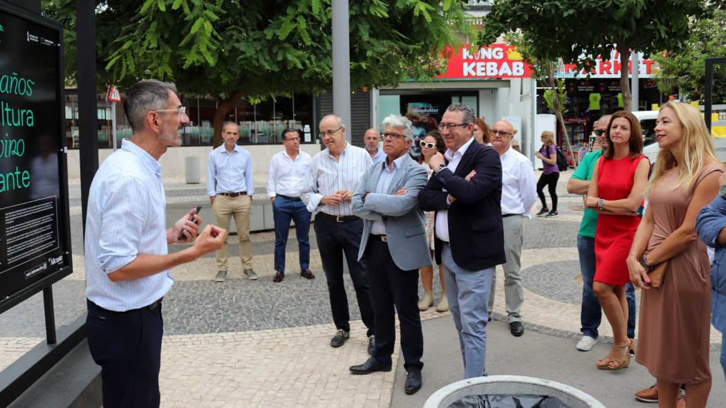 La plaza de la Hispanidad, uno de los puntos más transitados por vecinos y turistas de Benidorm, es desde este martes escenario de la exposición itinerante ‘3.000 años de cultura del vino Alicante’, promovida por el Consejo Regulador de la DOP Alicante y la Concejalía de Patrimonio Histórico y Cultural. El alcalde Toni Pérez, ha sido el encargado de inaugurar esta muestra en compañía de Juan José Reus, presidente de la Denominación de Origen Vinos de Alicante; la concejal de Patrimonio Histórico y Cultural, Ana Pellicer; y el comisario de la exposición, Eladio Aniorte. Todos ellos han animado al público a recorrer la muestra, que podrá visitarse en este enclave hasta el próximo 15 de noviembre.