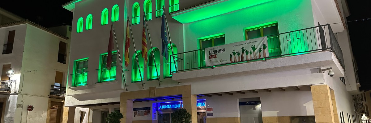 Desde ayer jueves La Nucía se tiñe de “verde”, con la iluminación de sus edificios para conmemorar el “Día Mundial del Alzheimer”. Durante toda la semana la iluminación del Ayuntamiento, Estadi Olímpic y Pabellón Muixara, así como de las fuentes de las rotondas es “verde”, sumándose a la campaña nacional.