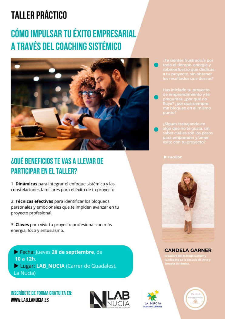 Este jueves 28 de septiembre de 10 a 12 horas el Lab_Nucia albergará el Taller Práctico “Cómo impulsar tu éxito empresarial a través del Coaching Sistémico”. Esta formación gratuita está enfocada a personas empresarias, comerciantes y/o emprendedoras. Sólo quedan las últimas plazas, por lo que todas las personas interesadas deben inscribirse en: http://lab.lanucia.es/Taller-Coaching-Sistemico-Septiembre-2023