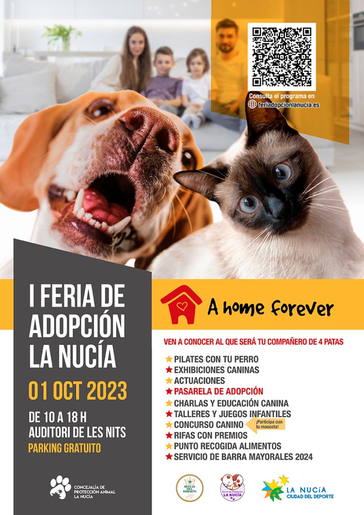 Este domingo de 10 a 18 horas en l’Auditori de Les Nits se celebrará la I Feria de Adopción Animal de La Nucía. El objetivo de este evento es promover la adopción de los animales domésticos que se encuentran sin hogar, abandonados. En esta I Feria de Adopción participarán 24 asociaciones y protectoras de toda la comarca. La entrada será libre y gratuita y toda la información está en https://feriadopcionlanucia.es/