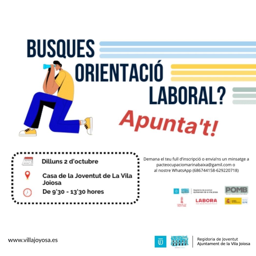 La Casa de la Juventud acogerá el lunes 2 de octubre una jornada de asesoramiento para personas demandantes de empleo, trabajadores en activo que quieran mejorar su situación y aquellas que se inicien en el mundo laboral. Técnicos especializados atenderán de manera individual a cada asistente para orientarle en tareas de búsqueda de empleo y de formación professional. Esta es una de las iniciativas que forman parte del Pacto Territorial por el Empleo de la Marina Baixa.