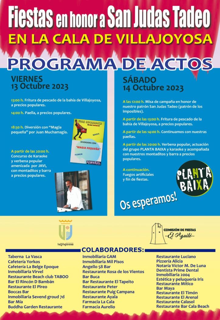 El sábado, a las 12.00 horas, tendrá lugar una misa de campaña en honor a su patrón, San Judas Tadeo, en la avenida Rosa dels Vents. A mediodía, de nuevo, se ofrecerá fritura de pescado de la bahía de Villajoyosa y paella. Por la noche, vuelve la fiesta con música, con la actuación del grupo de pop rock local Planta Baixa, además de una verbena y karaoke. Un castillo de fuegos artificiales pondrá punto y final a las fiestas de La Cala.