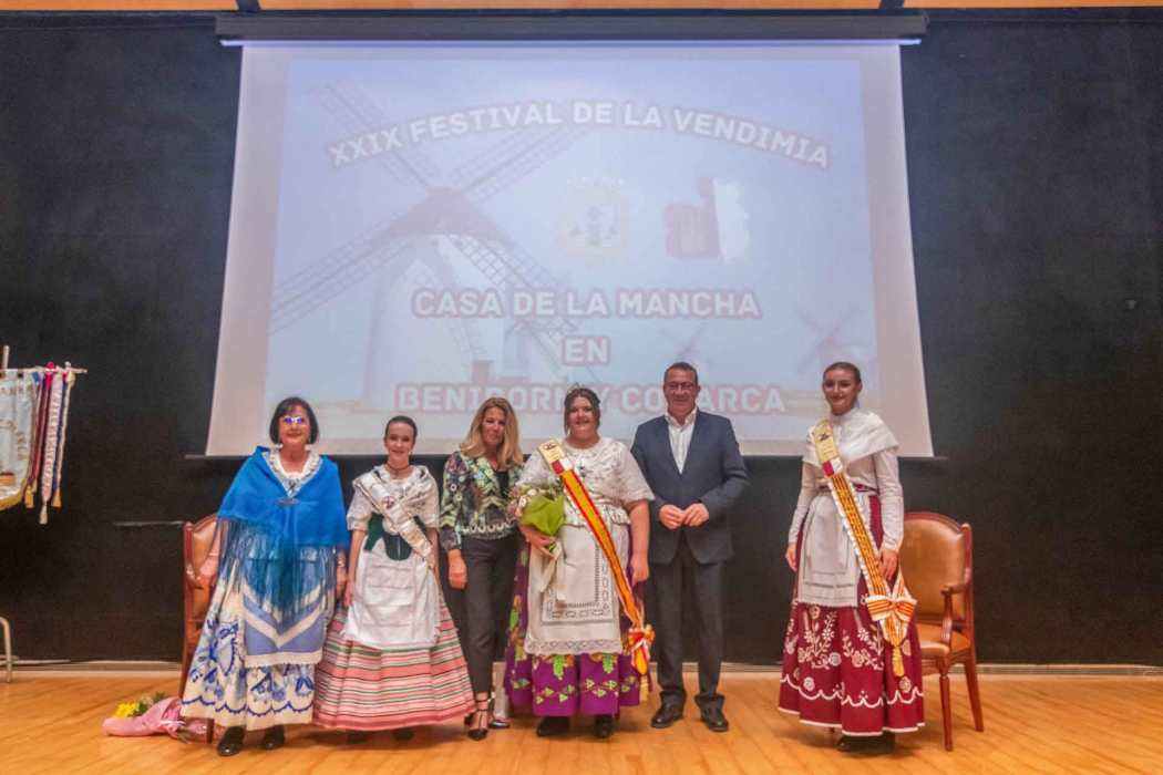 El alcalde de Benidorm, Toni Pérez, junto a la concejal de Fiestas, Mariló Cebreros, y otros miembros de la corporación participaron en esta edición del Festival de la Vendimia; también el diputado autonómico, José Ramón González de Zárate, las reinas Mayor en Infantil de las Festes Majors Patronas 2023, Angélica Morenilla y Daniela Talavera; representantes de los diferentes colectivos festeros locales y el presidente de la Casa Regional de Castilla La Mancha en Valencia, Jesús Martínez Gabaldón quienes han arropado, en su día grande, a la Casa de La Mancha en la ciudad y a su presidenta, Loren Torres.