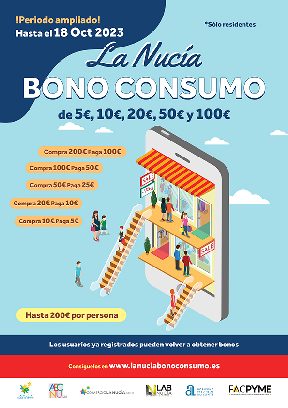 En esta Campaña de “Bono Consumos de La Nucía 2023” se puede comprar y consumir en La Nucía en los 70 comercios adheridos y beneficiarse, ya que al comprar con el “bono consumo” el valor del dinero se duplica. La III Campaña de “Bono Consumo” de La Nucía comenzó el 5 de septiembre y finalizará tras prorrogarse el 18 de octubre, y no el 30 de septiembre como estaba previsto.