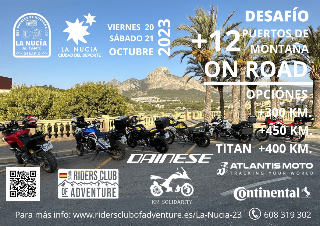 Los moteros y moteras interesadas en participar pueden optar entre las tres opciones del “Desafío Riders La Nucía 2023”: Rookie + 300 km., Pro + 450 km y TITAN +400 km. El viernes 20 de octubre a partir de las 16 horas se abrirá “el paddock” donde se realizarán las verificaciones, entrega de dorsales y bolsa de bienvenida. A continuación, a las 20 horas tendrá lugar el briefing, para dar toda la información a los participantes. El sábado 21 de octubre a las 7 horas de la mañana será la salida Motos modalidad Titán y a las 8 horas Motos Pro y Rookie. A todos los participantes se les entregará un track que tendrán que completar durante todo el día, no es circular, por lo que los moteros pararán a comer en l’Auditori Les Nits y proseguirán su ruta. El objetivo es completar los 12 puertos de montaña por las carreteras de la provincia de Alicante.