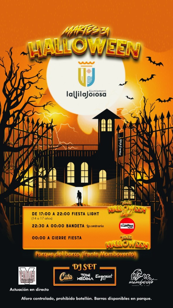 La noche más terrorífica del año se celebrará con los djs locales Cüta, Toni Medina y Eugeniet, además de la banda de música La Contraria. La fiesta arrancará a las 17.00 horas con una sesión light para los adolescentes entre 14 y 17 años y continuará hasta las 3.00 horas en el parque de la playa centro, conocido popularmente como “parque del barco”, junto a la discoteca Mambovento, que colabora con el Ayuntamiento en la organización de esta fiesta juvenil.