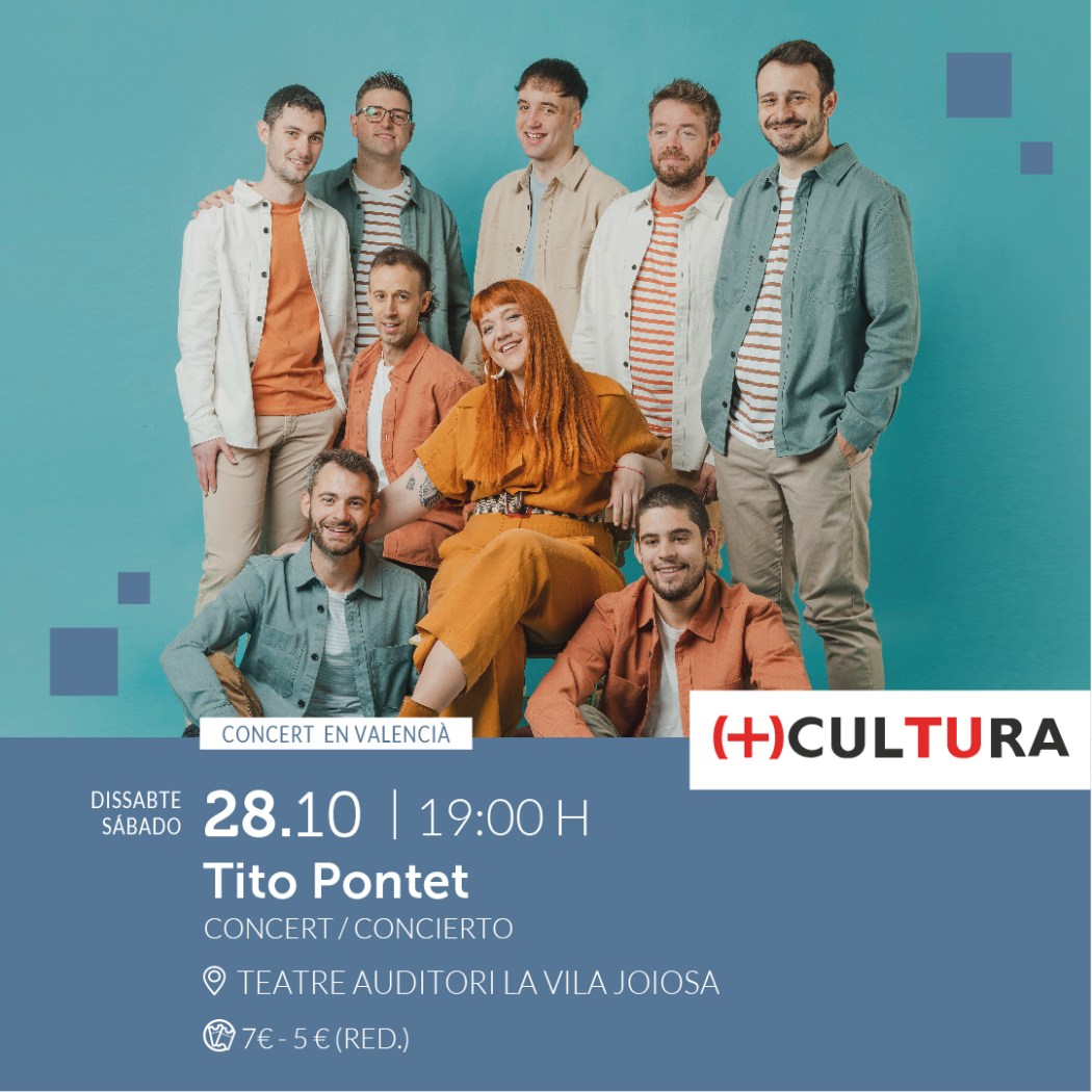 Este sábado, el grupo musical Tito Pontet actúa en el Teatro Auditorio de Villajoyosa. Los 10 componentes de esta banda de música jamaicana y latina proceden L’Alcoià y El Comtat. Su actuación, encabezada por la voz de Alba Terol, hace bailar todo el territorio a ritmo de cumbia, reggae, calypso, ska, mambo, salsa y otros estilos musicales principalmente herencia del continente africano y de américa latina.