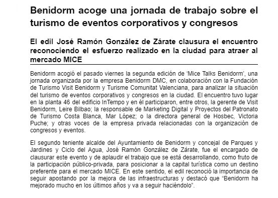 BENIDORM ACOGE UNA JORNADA DE TRABAJO SOBRE EL TURISMO DE EVENTOS CORPORATIVOS Y CONGRESOS