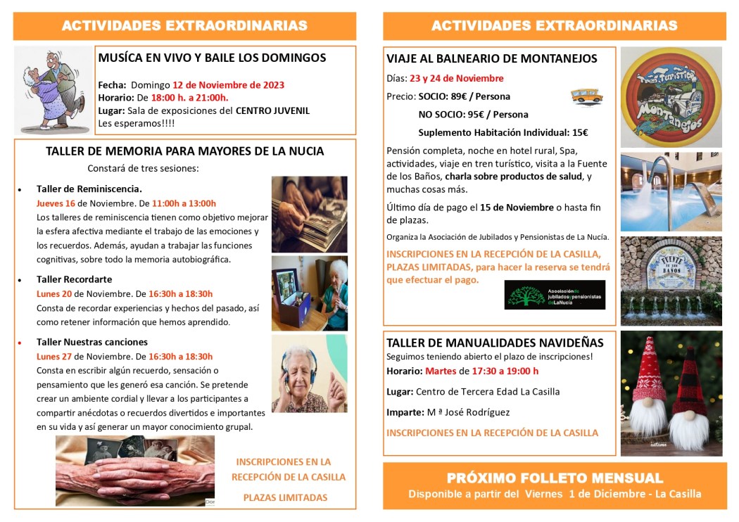 La concejalía de la Tercera Edad en colaboración con la Asociación de Jubilados y Pensionistas de La Nucía ha elaborado la programación de actividades para el mes de noviembre de 2023, entre ellas destaca los talleres de memoria y de manualidades navideñas. También seguirá el baile dominical con música en directo y se realizará un viaje de dos días al balneario de Montanejos.