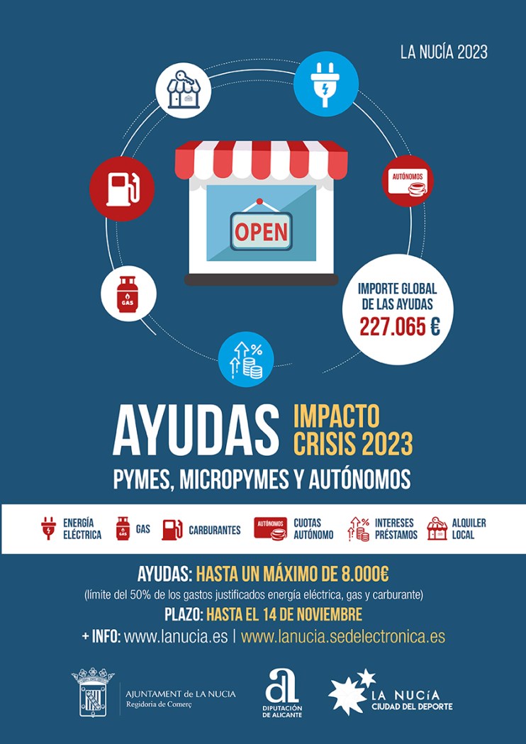 Estas “Ayudas para minimizar el impacto de la Crisis 2023 del Ayuntamiento de La Nucía son posibles gracias a la subvención de 227.065 euros de la Diputación Provincial de Alicante. El objetivo esta nueva línea de ayudas es “intentar paliar parte del impacto económico que ha tenido y tiene la subida de luz, gas y carburantes en las pymes, micropymes y autónomos de La Nucía”.