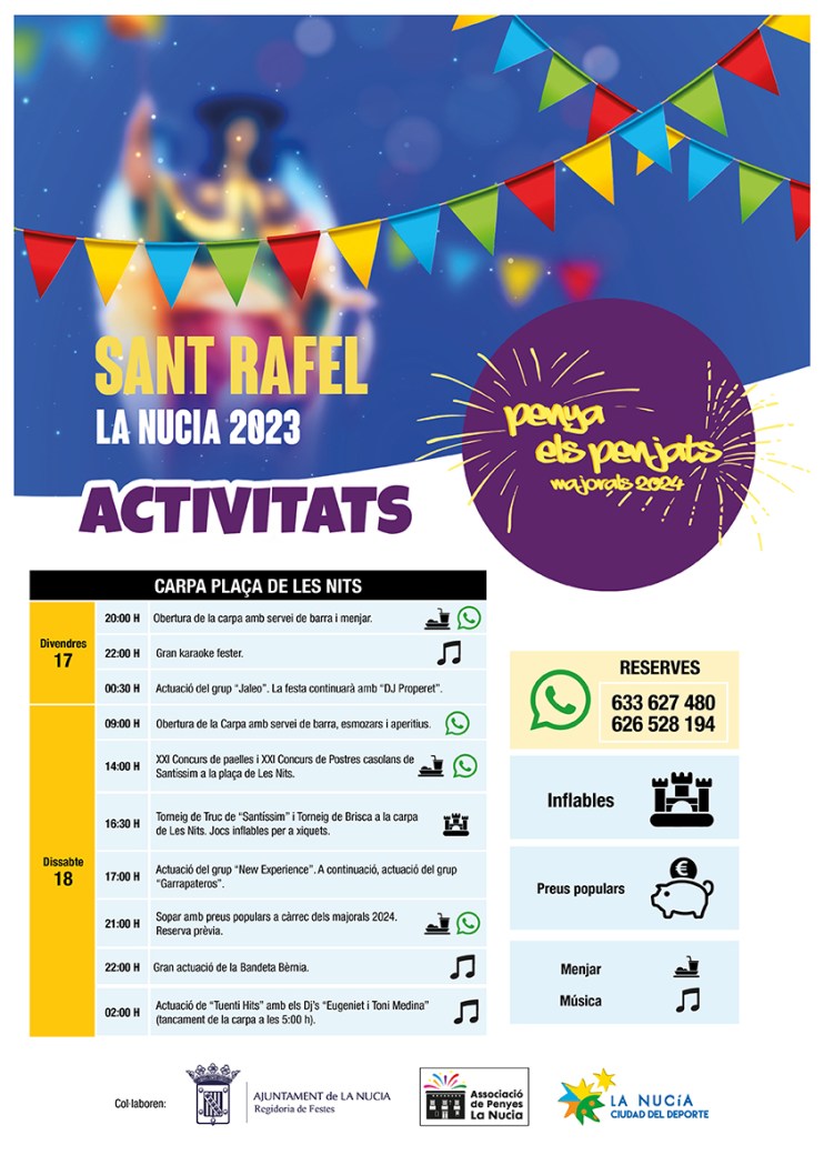 Les “Festes de Santíssim Sacrament i Sant Rafael” de La Nucía se desarrollan este fin de semana, el tercero de noviembre como marca la tradición. Son las fiestas patronales de La Nucía y en ellas se conmemora la fundación de la parroquia de La Nucía, con el traslado del “Santíssim Sacrament” de Polop a La Nucía (sábado, Día de Santíssim) y la festividad de “Sant Rafel” (copatrón de La Nucía) el domingo. Pero donde también habrá actos organizados por els Majorals 2024- Penya Els Penjats en la “carpa festera”.