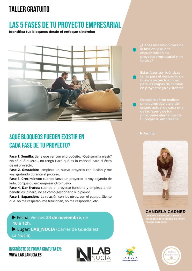 El Taller “Las 5 fases de tu proyecto empresarial” se celebrará en Lab_Nucia el 24 de noviembre de 10 a 12 horas. Esta semana se han abierto las inscripciones para este taller totalmente gratuito, enfocado a empresas y emprendedores. Las inscripciones se pueden realizar ya en: http://lab.lanucia.es/Taller-Gratuito-Fases-Proyecto-Empresarial-2023