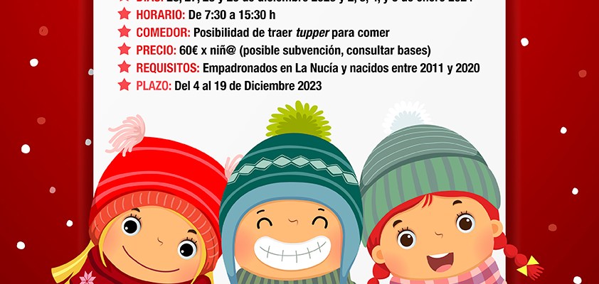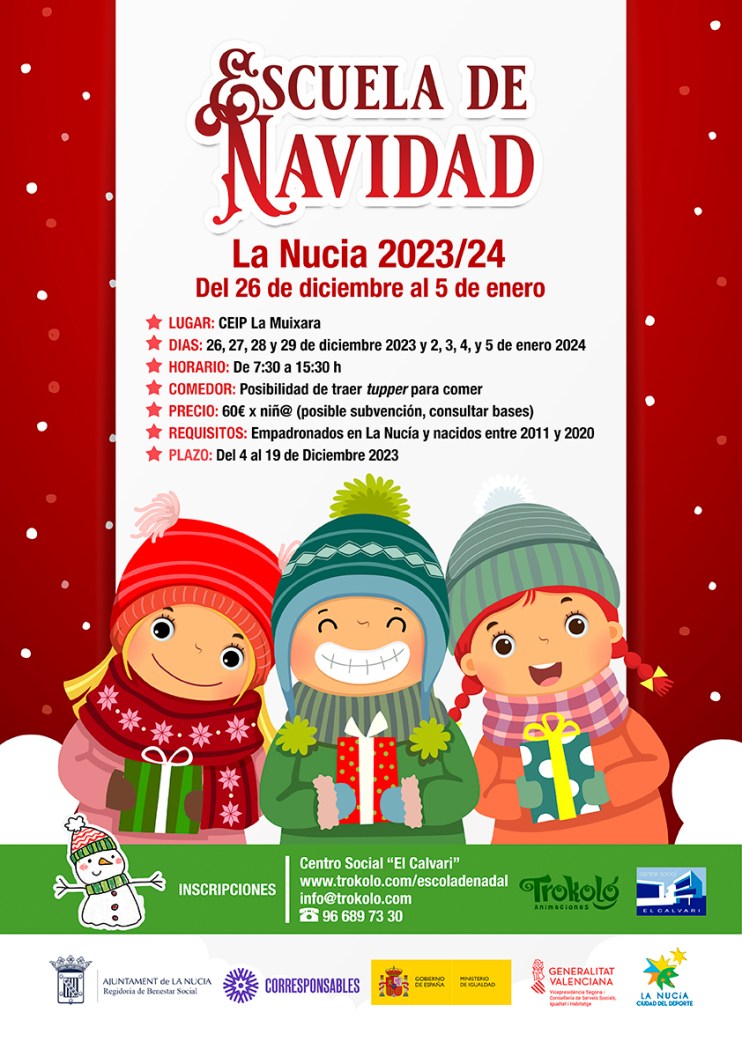 La XIV Escuela de Navidad está organizada por la concejalía de Bienestar Social y su objetivo es ayudar a conciliar la vida laboral y familiar durante las vacaciones escolares de Navidad, a las familias de La Nucía. La XIV Escuela de Navidad tendrá una duración de 8 días y un precio de 60 € por escolar. Esta edición cuenta con una subvención de 15 € por escolar del “Plan Corresponsables” de la Generalitat Valenciana y Ministerio de Igualdad, que se puede consultar en las bases para optar a ella.