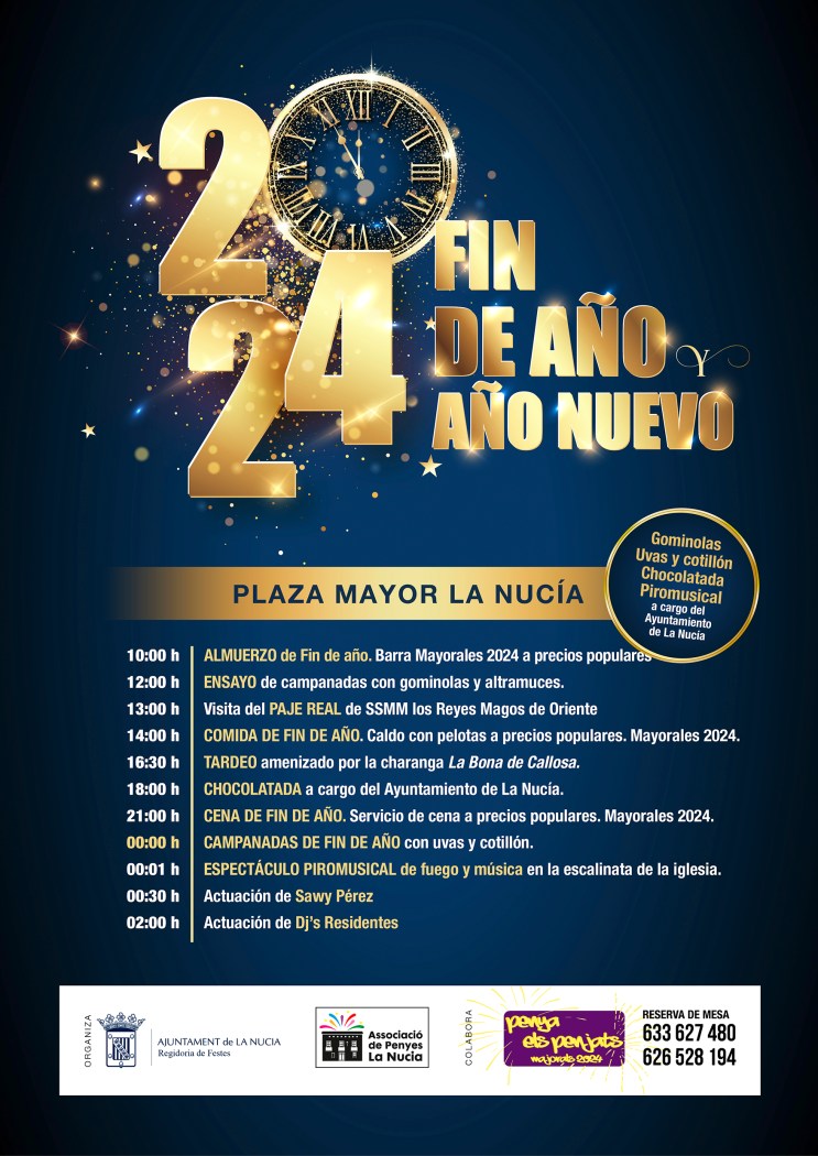 Esta gran “Fiesta de Fin de Año” está organizada por el Ayuntamiento de La Nucía y l’Associació de Penyes con la colaboración dels Majorals 2024-Penya Els Penjats.