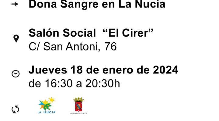 El Salón Social El Cirer acoge una nueva donación de sangre el próximo jueves 18 de enero por la tarde, de 16,30 a 20,30 horas. El Centro de Transfusión de la Comunitat Valenciana se desplazará a La Nucía por segunda vez este año. Para donar sangre no es necesario preinscribirse, ni tener carnet de donante. Desde la concejalía de Sanidad se recuerda que “la sangre es más necesaria que nunca, por las peticiones de los hospitales de la provincia”, por lo que hace un llamamiento a participar en la donación de sangre.