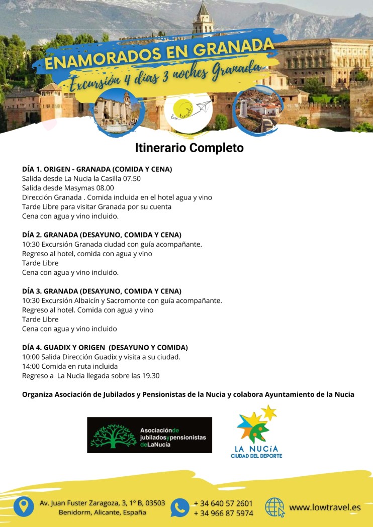 La Asociación de Jubilados y Pensionistas de La Nucía con la colaboración de la concejalía de Tercera Edad ha programado un “Viaje de Enamorados a Granada” para el próximo mes de febrero, del 20 al 23 de febrero. El viaje incluye desplazamiento en autobús, alojamiento den Hotel de 4 estrellas en pensión completa y tiene un precio de 290 euros para socios de la Asociación y 310 socios para no socios. Sólo quedan las últimas plazas.