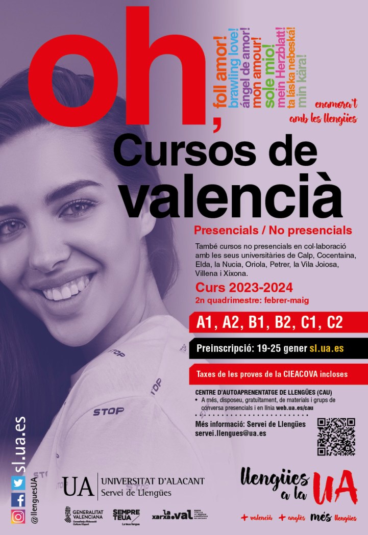 Para inscribirse hay que acreditar poseer el C1 (nivel mitjà valencià). El plazo de inscripción para este “Curs Superior de Valencià” (C2) será del 19 al 25 de enero en el Servei de Llengües de la Universitat d’Alacant (https://sl.ua.es/va/). Es un curso de 60 horas que tendrá dos clases en línea a la semana por la tarde (lunes y miércoles de 18 a 20 horas), del 5 de febrero al 22 de mayo. Es un curso no presencial, en formato on-line.