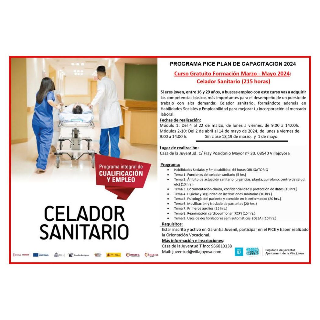 La concejalía de Juventud del Ayuntamiento de Villajoyosa ofrece un curso gratuito que permitirá a sus asistentes trabajar como celador en el ámbito sanitario. El curso está dirigido a jóvenes con edades comprendidas entre los 16 y 29 años. El objetivo, según explica el concejal de Juventud, Carlos Soler, es “ofrecer mayor formación a los jóvenes vileros y facilitarles la obtención de conocimientos y estudios para que puedan acceder al mundo laboral. Queremos que todos los jóvenes estén preparados para poder conseguir un trabajo fácilmente y, por ello, vamos a continuar ofertando más cursos de formación específica para ellos”.