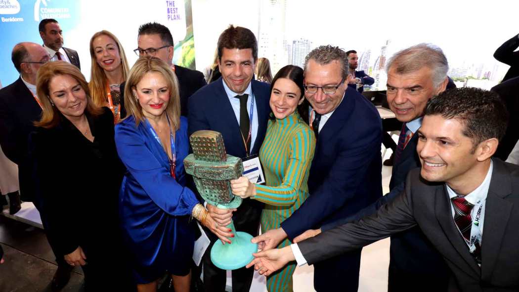 El stand de Benidorm ha sido la primera parada del presidente de la Generalitat, Carlos Mazón, en el recorrido que ha realizado por los distintos espacios de la Comunidad Valenciana en la Feria Internacional de Turismo (Fitur) de Madrid, en la que hoy se celebra el día de la región. El alcalde, Toni Pérez; el presidente de la patronal hotelera Hosbec, Fede Fuster; la secretaria general de la entidad, Maite García; el presidente de la CEV, Salvador Navarro; y miembros de la Corporación municipal han recibido al presidente en el stand de Benidorm, donde ha llegado acompañado por diferentes miembros del Consell, entre ellos la consellera de Turismo, Nuria Montes.