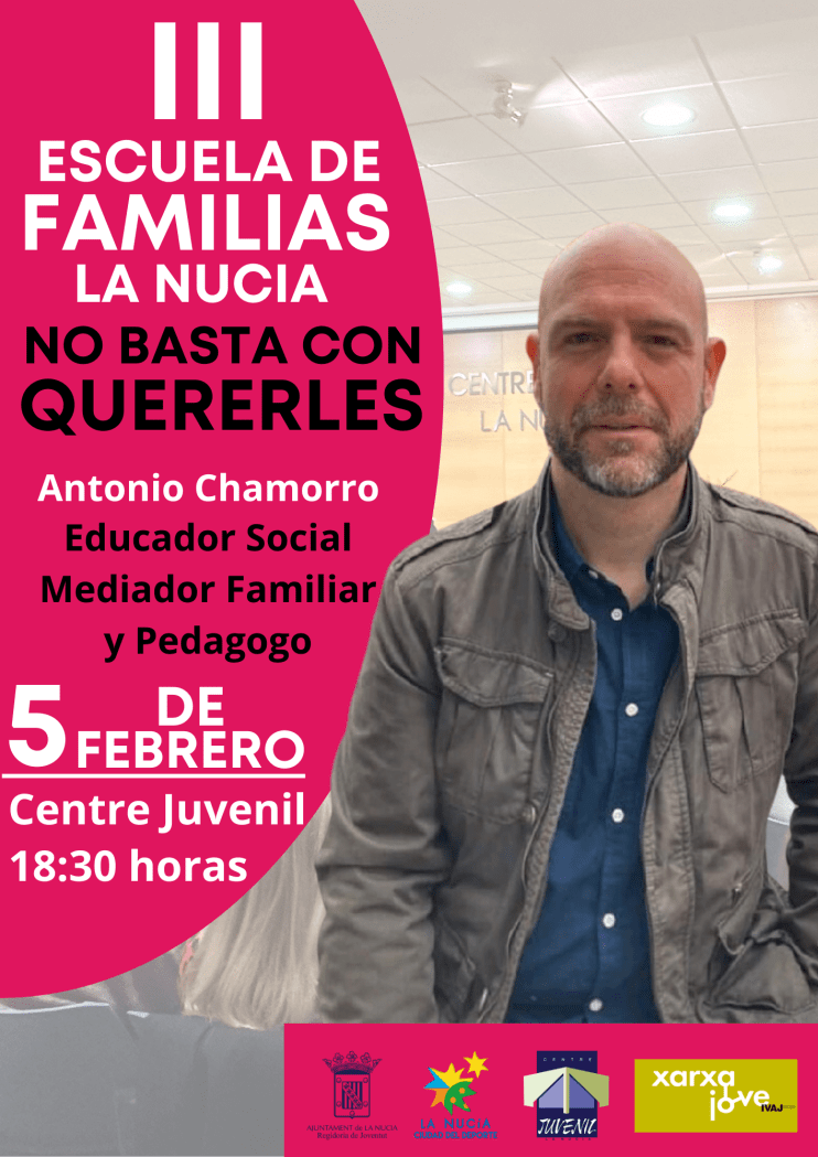 El prestigioso pedagogo y educador social Antonio Chamorro con la charla “No Basta con Quererles” estará el próximo lunes 5 de febrero a las 18,30 horas en el Centre Juvenil de La Nucía. Será la cuarta ponencia de la “III Escuela de Familias” de La Nucía. La entrada es libre y gratuita, aunque se recomienda la preinscripción (966897070), al haber plazas limitadas.