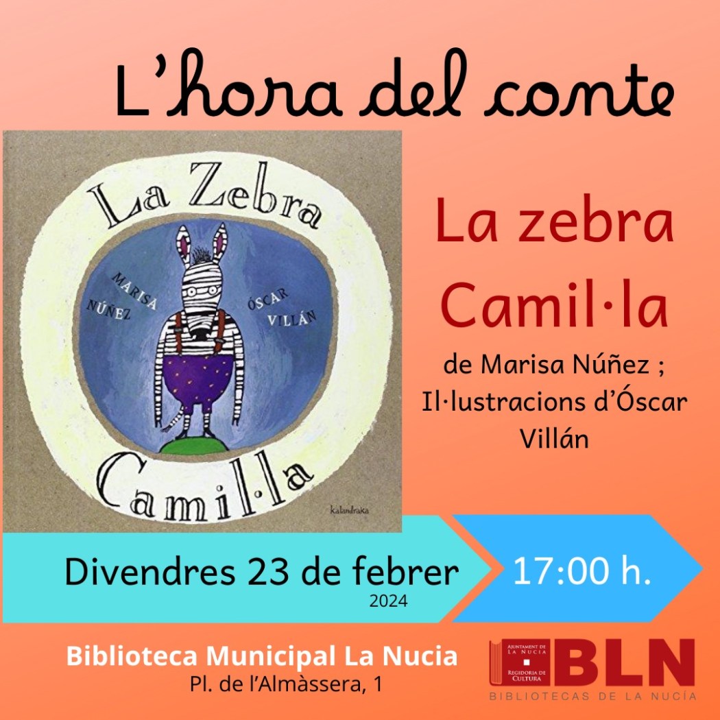 El cuento en valenciano “La zebra Camil.la” será el protagonista de esta segunda sesión de “L’hora del Conte” de la Biblioteca Municipal de La Nucía, mañana viernes 23 de febrero a las 17 horas. “La zebra Camil.la” está escrita por Marisa Nuñez con ilustraciones de Óscar Villán.