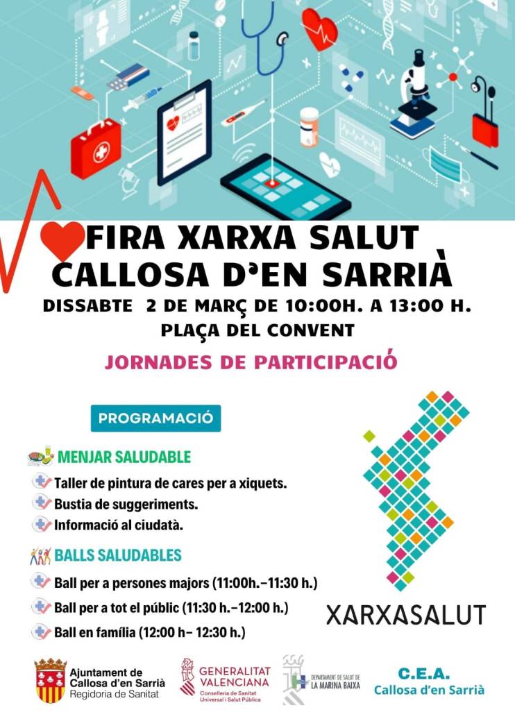 El Ayuntamiento de Callosa d’en Sarrià, a través de la Concejalía de Sanidad, junto a la Consellería de Sanitat, el Departamento de Salud de la Marina Baixa y el CEA de Callosa d’en Sarrià, han preparado una jornada lúdica de participación para promocionar la Xarxa Salut, una iniciativa a la que Callosa está adherida, y que tiene como objetivo desarrollar acciones de promoción de salud entre los habitantes de los municipios de la Comunitat Valenciana.