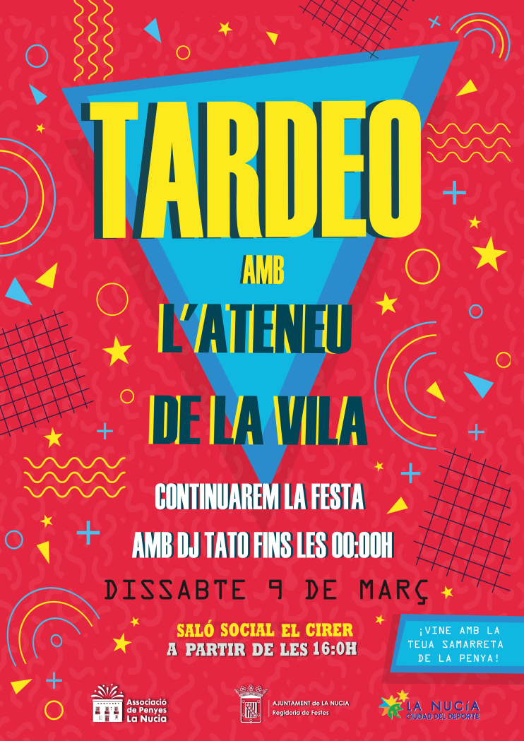 El “Tardeo Fester” de l’Associació de Penyes de La Nucia se desarrollará el próximo sábado 9 de marzo a partir de las 16 horas en el Salón Social El Cirer. Contará con la actuación de la bandeta de “Ateneu de la Vila” y DJ Tato. La entrada será libre y gratuita.