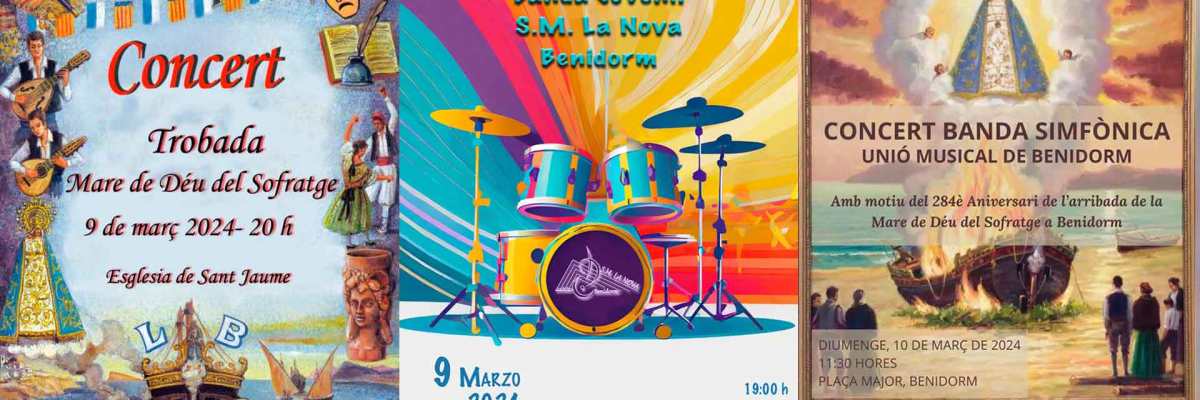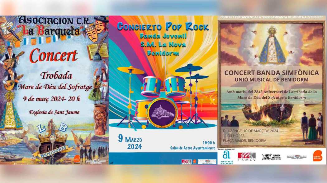 La música de varios géneros tomará el protagonismo este fin de semana en Benidorm con el amparo de la Concejalía de Cultura del Ayuntamiento local con la programación de tres conciertos el sábado y domingo de la mano de la Banda de la Escuela de la Sociedad Musical la Nova, la Rondalla de la ACR La Barqueta y la Banda Sinfónica de la Unión Musical de Benidorm.
