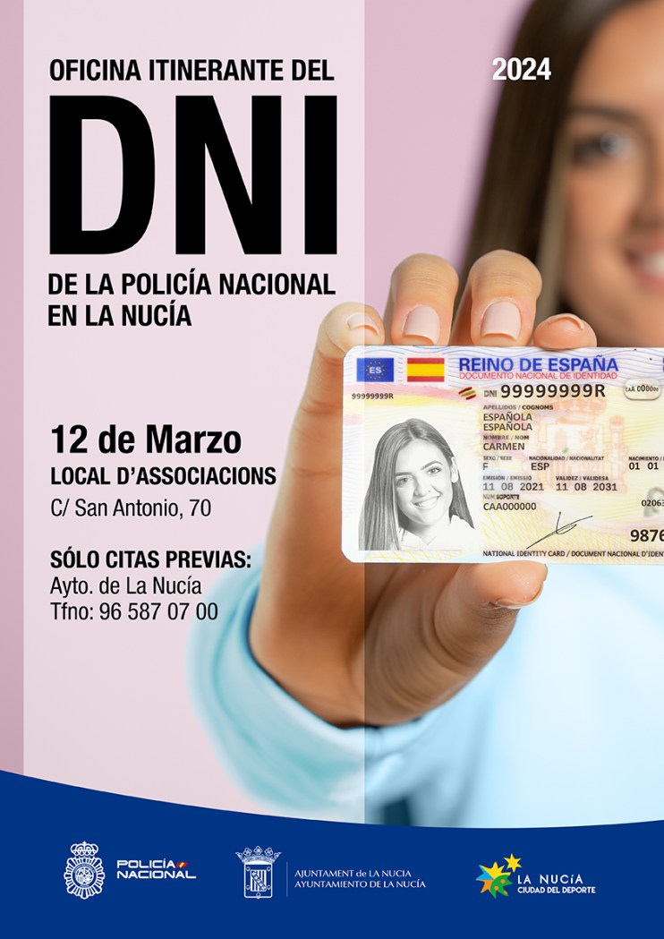 La oficina itinerante del DNI de la Policía Nacional acudirá a La Nucía el próximo martes 12 de marzo de 2024. Esta oficina del DNI se situará en el Local d’Associacions y atenderá sólo citas previas, que se dan en el Ayuntamiento de La Nucía (965870700). El cupo por visita está en 100 citas, por lo que las plazas son limitadas. Se recomienda a todos los vecinos y vecinas interesados solicitar la cita lo antes posible.