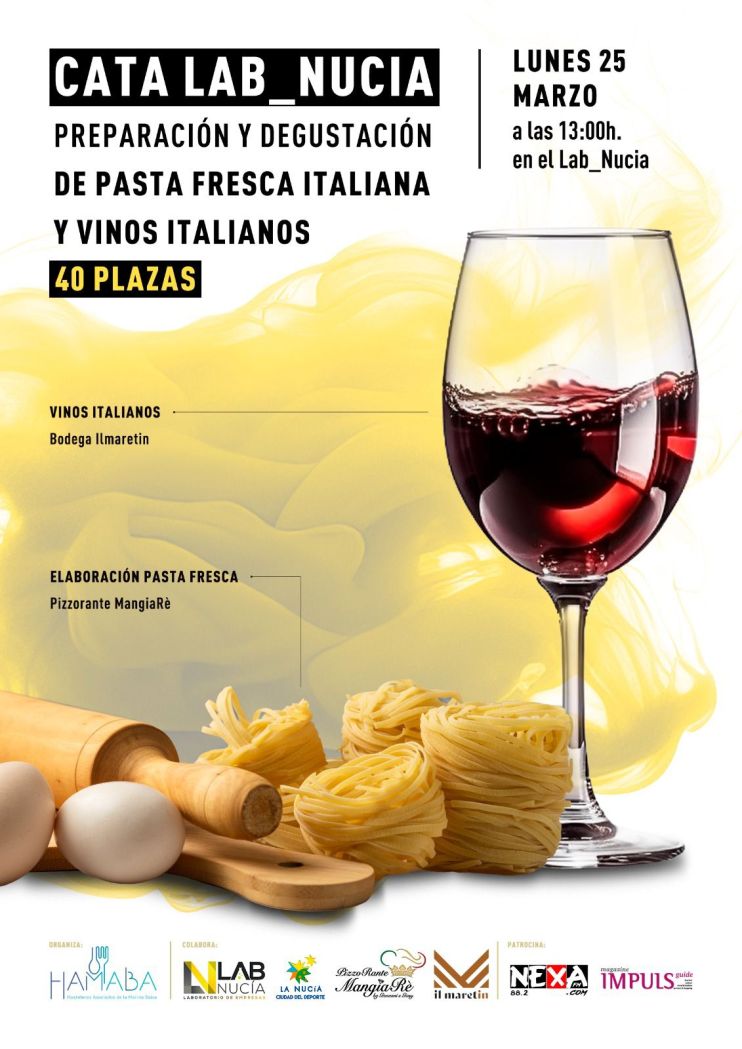 El próximo lunes 25 de marzo tendrá lugar una nueva sesión gastronómica en el Laboratorio de Empresas de La Nucía. Se trata de una degustación de pasta fresca y vinos italianos organizada por Hamaba (Hosteleros Asociados de la Marina Baixa) y Lab_Nucia. En ella se realizara la preparación y degustación de Pasta Fresca Italiana por parte de “Pizzorante MangiaRè” y degustación de vinos italianos de la bodega “Il Maretin”. Esta actividad gastronómica es gratuita pero con plazas limitadas a 40; las inscripciones se realizan en el siguiente enlace: http://lab.lanucia.es/Cata-Hamaba-25-Marzo2024-LabNucia