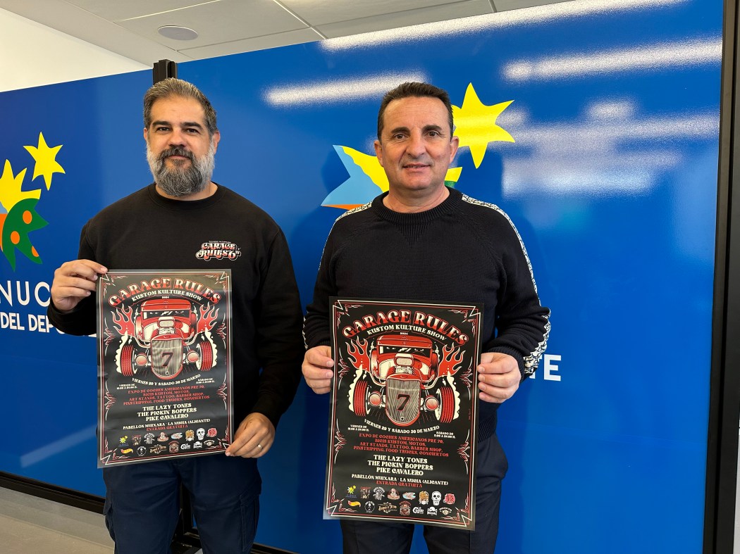 La presentación del VII Garage Rules contó con la presencia de Miguel Orihuela, organizador de Garage Rules y presidente de la Asociación de Vehículos Clásicos de La Nucía y Bernabé Cano, alcalde de La Nucía.