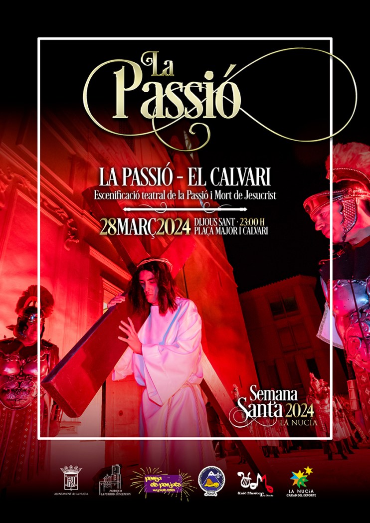 Esta representación teatral religiosa comenzó en 1998 como iniciativa del Grup Scout La Nucia y un grupo de aficionados al teatro y vecinos de este pueblo, como una experiencia, con el apoyo del Ayuntamiento. Tras el parón por la pandemia de tres años (2020, 2021 y 2022), se retomó el año pasado en 2023. La representación de “La Passió” cumple 24 ediciones en 2024. Es un acto que congrega a numeroso público tanto en la plaça Major como en el monte Calvari, por su singularidad de representarse por la noche y al aire libre, bajo la luz de la luna llena, dentro de los actos de la Semana Santa de La Nucía.