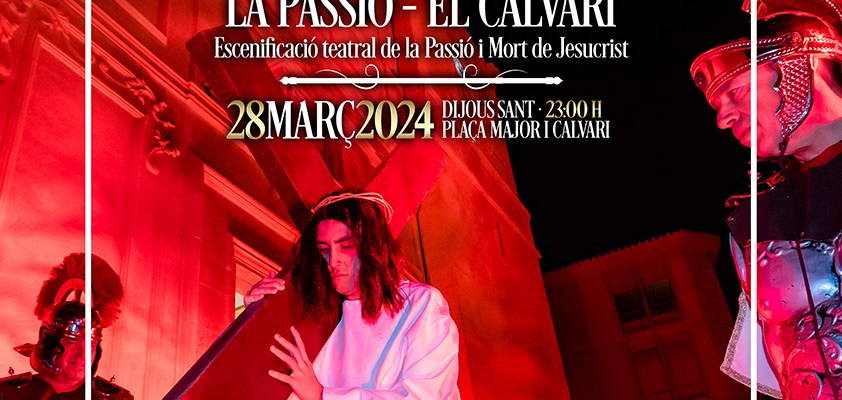 Con el escenario de la escalinata de la Iglesia y el Calvari de fondo en “La Passió” se representan las últimas 12 escenas de Jesucristo antes de ser crucificado, combinando luz, teatro, música y fuego.