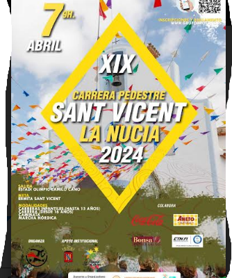 Este “XIX Carrera Pedestre de Sant Vicent” está organizado por el Club de Atletismo de La Nucía y Grupo Brotons con la colaboración de la concejalía de Deportes y Turismo Deportivo Costa Blanca. Prueba patrocinada por Coca Cola, Bonsa y CTN FI (Centro de Recuperación Oficial).
