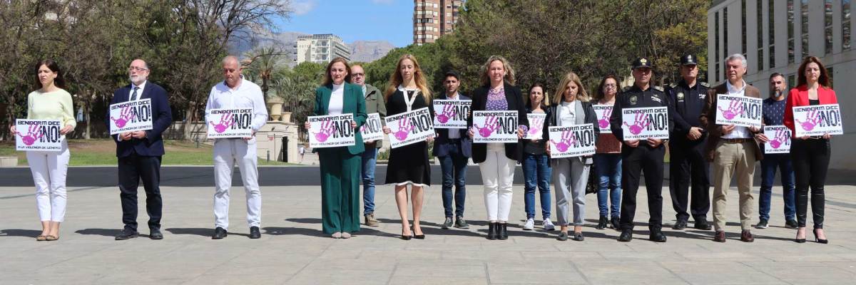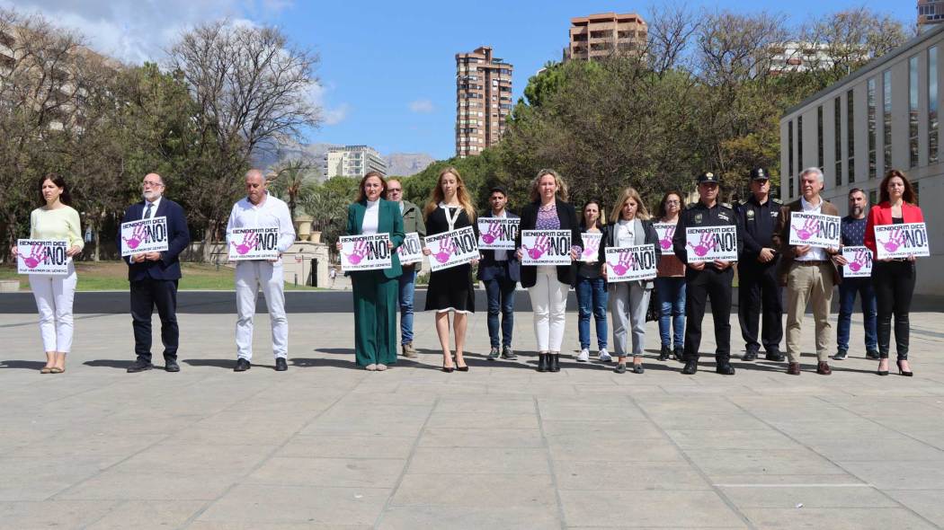 El Ayuntamiento de Benidorm ha mostrado este jueves su repulsa y condena por el último crimen relacionado con la violencia machista confirmado en nuestro país por la Delegación del Gobierno contra la Violencia de Género y que se ha saldado con tres víctimas, una mujer y sus dos hijos. La plaza del Ayuntamiento ha acogido una concentración silenciosa que ha estado encabezada por la primera teniente alcalde, Ana Pellicer, la concejal de Igualdad, Ángela Zaragozí, y en la que también han participado numerosos miembros de la Corporación municipal.