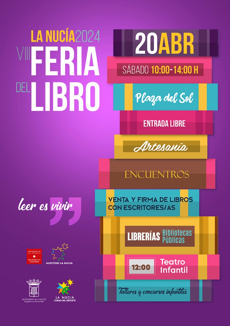 Mañana sábado 20 de abril de 10 a 14 horas se desarrollará la VIII Feria del Libro de La Nucía “Leer es vivir” en la plaza del Sol de La Nucía. Esta octava edición contará con encuentro con treinta escritores y escritoras, venta y firma de libros, actuaciones de teatro infantil, stands de librerías y bibliotecas municipales, talleres y concursos infantiles. La entrada para el público será libre y gratuita.