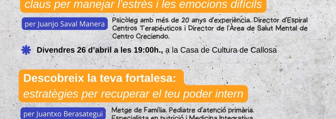 Las conferencias están dirigidas a familias, educadores y adolescentes. Se celebrarán todas ellas en la Casa de Cultura de Callos d’en Sarrià, y comienzan este viernes 26 de abril, a las 19:00 horas, con la primera de ellas, titulada “Salud mental: claves para manejar el estrés y las emociones difíciles”. La ponencia correrá a cargo del psicólogo Juanjo Saval Manera (Director de Espiral Centros Terapéuticos y Director del Área de Salud Mental de Centro Creciendo), y en ella los adolescentes podrán adquirir habilidades prácticas para gestionar su salud mental, especialmente en situaciones de estrés, con diferentes estrategias de afrontamiento para ayudar a los jóvenes a mantener la calma y la claridad en situaciones de alta presión emocional.