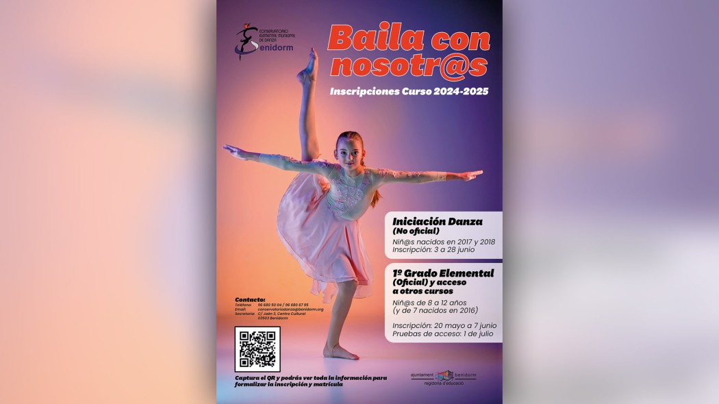 El Conservatorio Elemental Municipal de Danza de Benidorm abrirá el próximo lunes, 20 de mayo, el periodo de inscripción para el curso 2024-2025. De este modo, las personas interesadas en poder cursar en este centro oficial estudios de danza deberán presentar una solicitud de plaza escolar, bien de manera telemática a través del correo electrónico conservatoriodanza@benidorm.org o bien de manera presencial en el propio centro, ubicado en la calle Jaén, para lo que será necesario solicitar cita previa.
