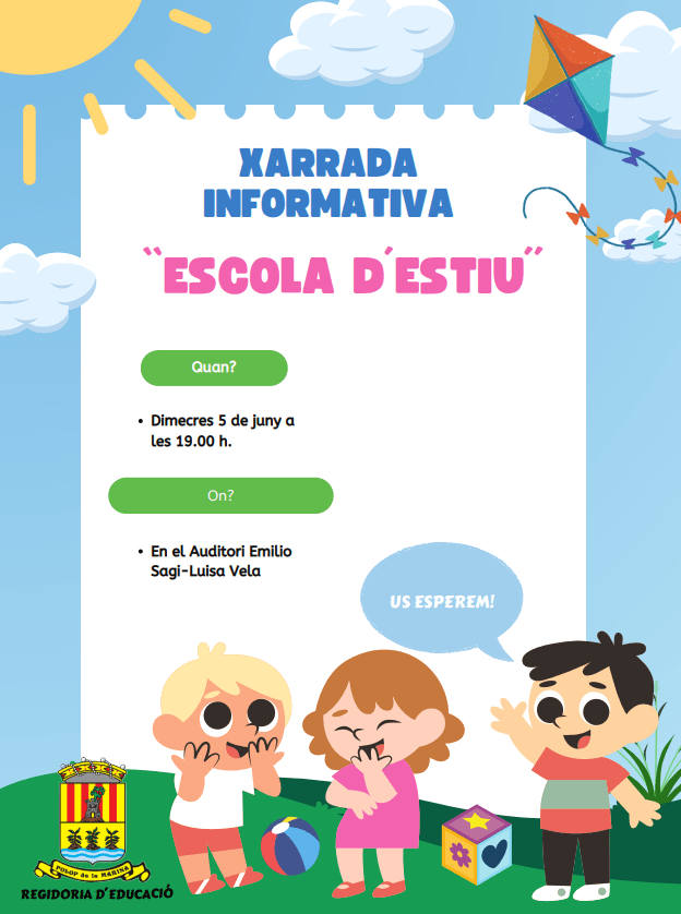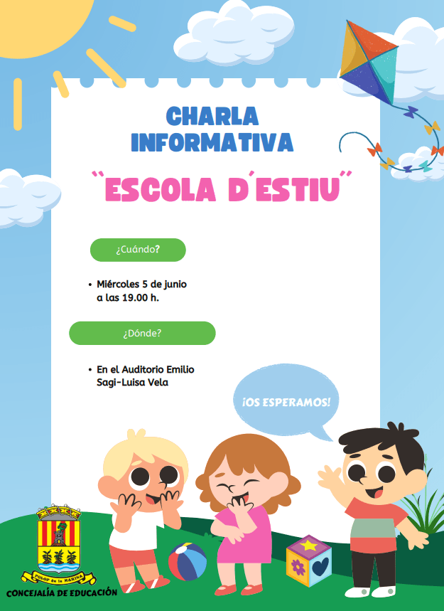 | Polop anuncia una reunión informativa sobre la Escola d’Estiu 2024El miércoles 5 de junio a las 19:00h., tendrá lugar en el Auditorio Emilio Sagi – Luisa Vela del edificio multiusos una reunión informativa sobre la escuela de verano que se realizará este año 2024.Desde la concejalía de Educación “se invita a las familias interesadas a conocer el proyecto y resolver las posibles dudas antes del inicio de la Escuela de Verano que se desarrollará del 24 de junio al 6 de septiembre” informa el Alcalde de la localidad José Luis Susmozas. 5 adjuntos — Descargar todos los archivos adjuntos Ver todas las imágenesESCUELA DE VERANO.png 172K Ver DescargarESCOLA D’ESTIU.png 150K Ver DescargarEscola d’Estiu 2024.jpg 197K Ver DescargarPolop anuncia una reunión informativa sobre la Escola d’Estiu 2024.docx 259K Visualizar como HTML DescargarPolop anuncia una reunión informativa sobre la Escola d’Estiu 2024.pdf 235K Visualizar como HTML Descargar | |