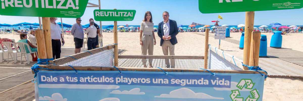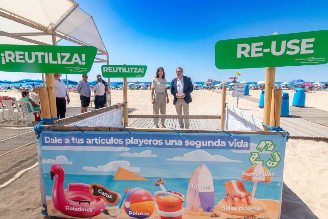 El Ayuntamiento de Benidorm ha puesto en marcha este martes una iniciativa pionera para promover la economía circular en las playas dando una nueva vida a los artículos playeros entre los turistas que van y vienen durante la temporada alta. El alcalde de la ciudad, Toni Pérez, y la edil de Playas y Medio Ambiente, Mónica Gómez, han presentado esta acción en el primero de los puntos limpios que se van a habilitar en los arenales para que los bañistas puedan depositar colchonetas, hamacas, flotadores, sombrillas, cubos, palas, tablas u otro tipo de objetos que se encuentren en buen estado y no vayan a necesitar al finalizar sus vacaciones, de modo que otros turistas puedan reutilizarlos.