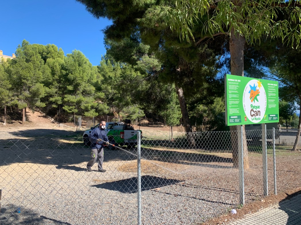 Los trabajos consisten en la desinfección de todo el recinto de cada Parque Can, así como sus accesos y perímetro. El método utilizado es la pulverización del producto desinfectador con una cuba de gran capacidad, así como mochilas, haciendo especial incidencia en las zonas de pasos de perros, utensilios, mobiliario urbano (bancos, papeleras, fuentes y dispensador de bolsas), así como toda la valla perimetral y la doble puerta de la entrada a la zona recreativa canina. Previo a la desinfección las brigadas municipales han realizado tareas de limpieza, desbroce y poda de la vegetación de estas zonas.